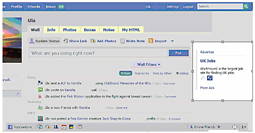 Z kolei reklama określana jako Social Ads to reklama, która została wpleciona w komunikację z "przyjaciółmi". Widząc zakładkę Nowe wydarzenia, użytkownik uzyskuje informacje dotyczące "przyjaciela", w tym związane z jego aktywnością na stronach przedsiębiorstw, np. w profilu użytkownika pojawia się wiadomość, że "przyjaciel" został fanem określonej firmy wraz z ekspozycją jej logo. Również elementy graficzne - głównie logo - są zamieszczane w profilach samych użytkowników w przypadku zamieszczenia wpisu na forum w profilu danej firmy, przystąpienia do grupy fanów danej marki.