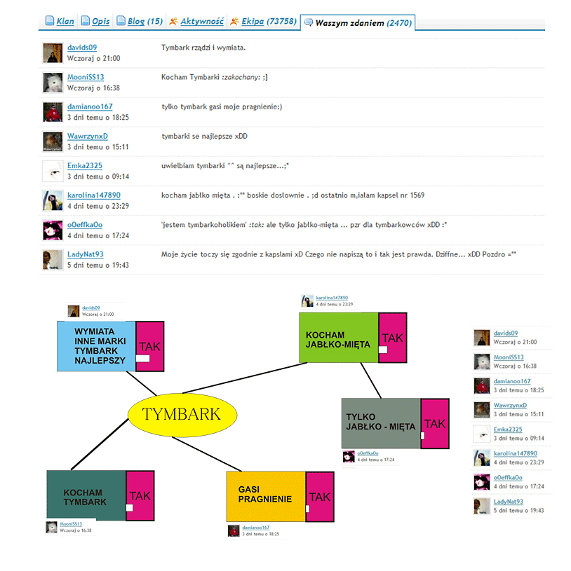 Na tradycyjnym forum wiele wypowiedzi powtarza się lub jest bardzo do siebie zbliżonych, np. w grupie Nike Club w serwisie Fotka.pl powtarzają się wpisy: super; lepsze ciuchy niż buty; super wygodne. Rozwiązaniem problemu powtarzania takich samych węzłów na forum wizualnym jest wprowadzenie opcji głosowania - użytkownicy, którzy podzielają opinie już zamieszczone, głosują, popierając dany wpis. Wyniki głosowania są ilustrowane w formie wykresu - im większa liczba głosów popierająca dane stwierdzenie, tym słupek wykresu wyższy. Wykres może obrazować procent użytkowników popierających stwierdzenie, a nie bezwzględną liczbę oddanych głosów (co pozwala uniknąć problemów technicznych, które wiązałyby się z wydłużaniem słupka wykresu wraz ze zwiększaniem liczby głosujących). Możliwe są również inne rozwiązania graficzne ilustrowania siły poparcia dla danego stwierdzenia, np. zwiększanie się wielkości węzła wraz z liczbą oddanych głosów lub zmiana grubości linii łączącej dany węzeł. Forum wizualne może zostać uzupełnione o awatary aktywnych użytkowników - umieszczone z boku mapy, natomiast awatar użytkownika zakładającego dany węzeł może zostać umieszczony w samym węźle (rys. 4). Poniżej przedstawiono przykład forum wizualnego utworzonego na podstawie analizy wpisów forum tekstowego grupy Tymbark, funkcjonującej w serwisie społecznościowym Fotka.pl.